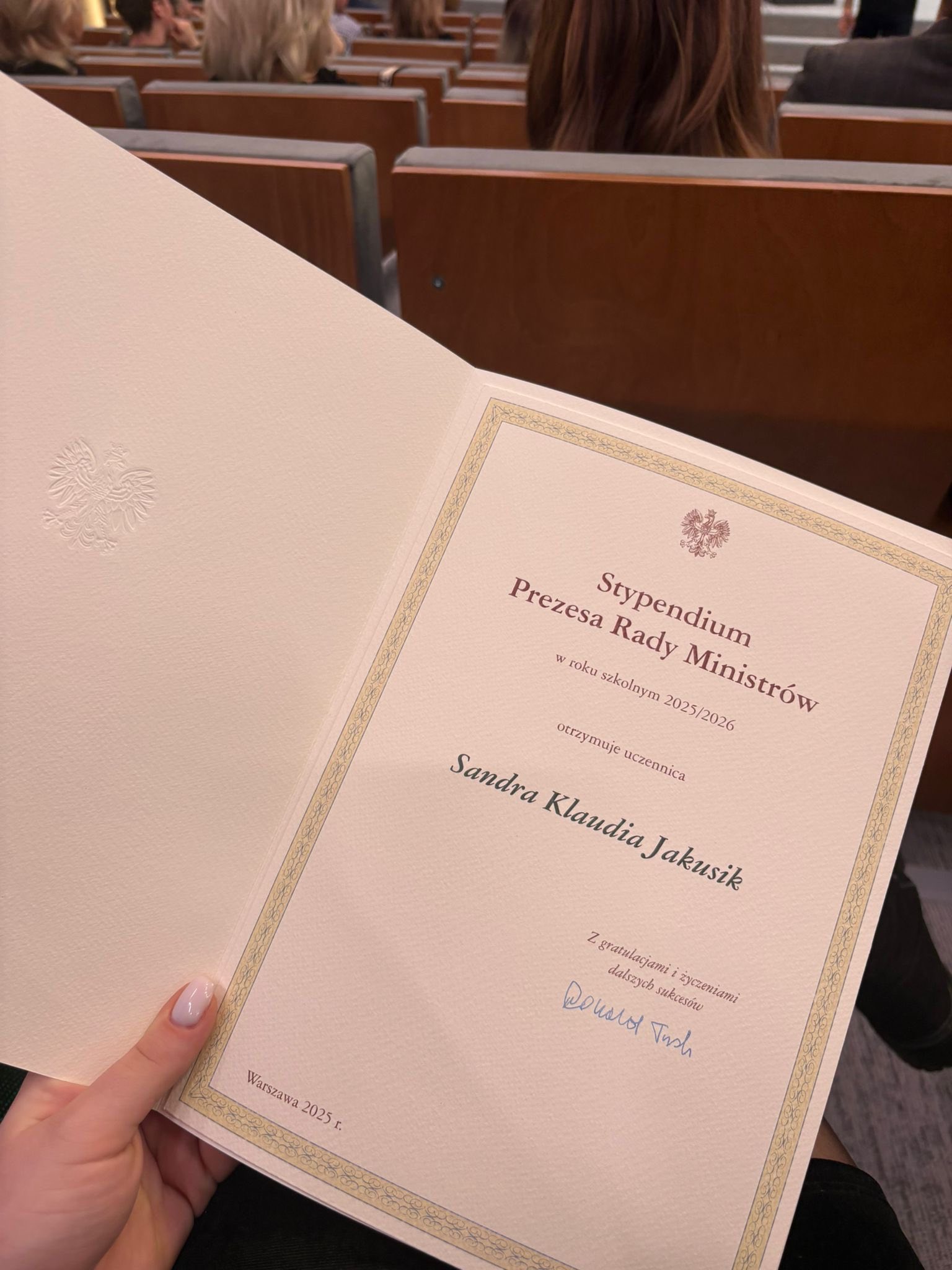 Z dumą informujemy, że uczennica Technikum ZDZ w Kazimierzy Wielkiej – Sandra Jakusik – otrzymała Stypendium Prezesa Rady Ministrów!