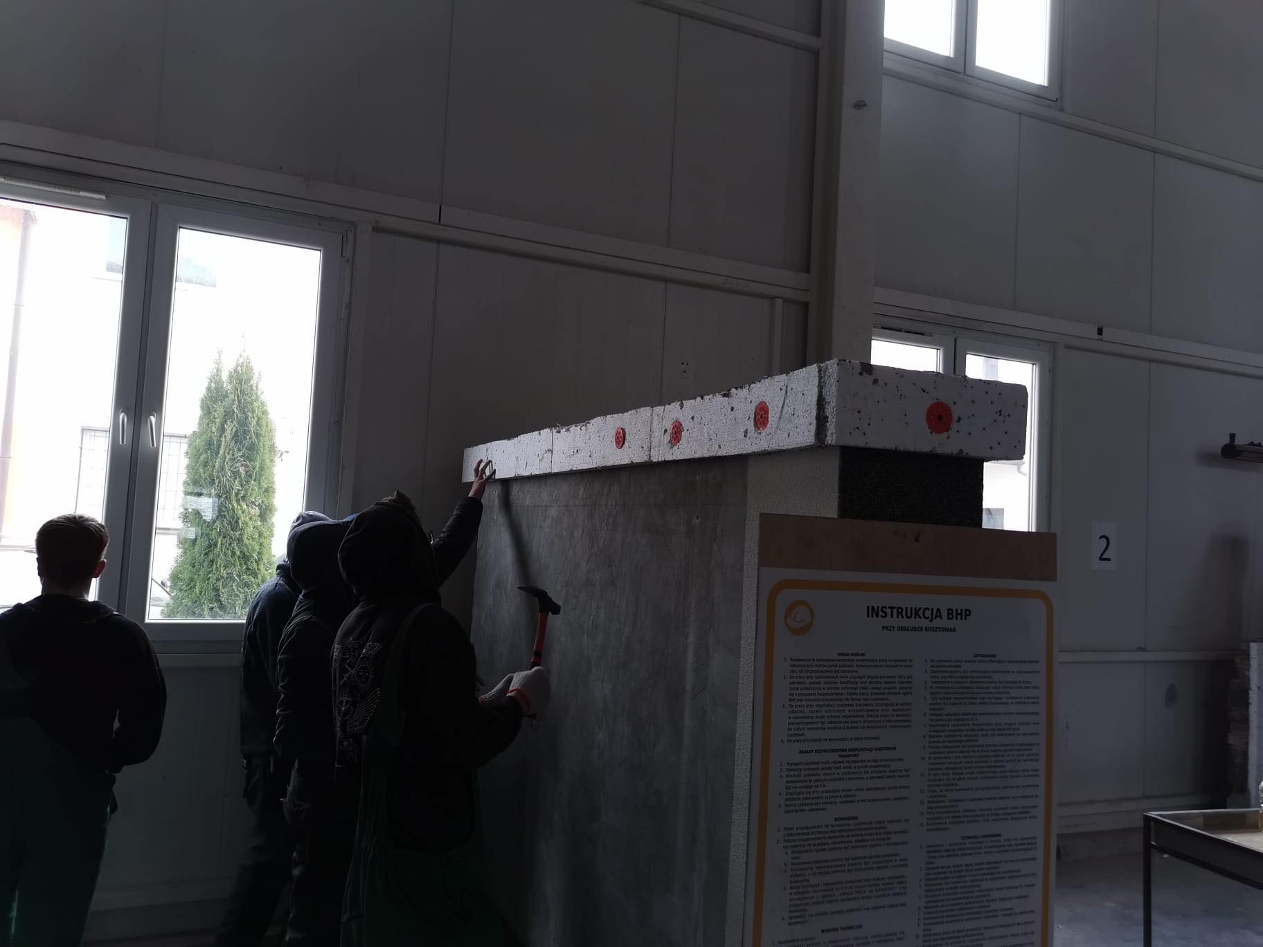Uczniowie klasy pierwszej o kierunku technik budownictwa podczas wykonywania boni styropianowch.